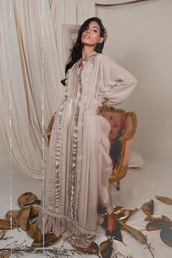 PRODUCT DETAILS 2PC Ready to wear Fabric: Georgette chiffon kaftan pure silk pants Work Technique: Embellished Color: Nude...