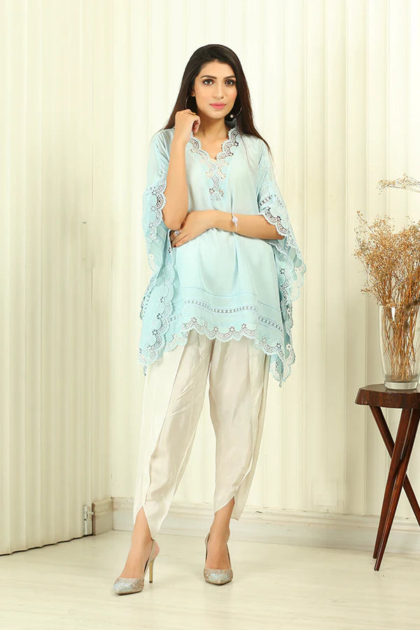 Description: Brighten up your day with the delicate, pastel-shaded, ice blue Kaftan. The modish Kaftan is adorned with floral embroidery. The exquisite ensemble is paired up with pure silk tulip shalwar.