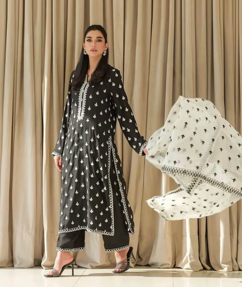 PRODUCT DETAILS 3Pc Ready to wear Colour: Black Fabric: Silk & Organza An exquisite raw silk ensemble with intricate...
