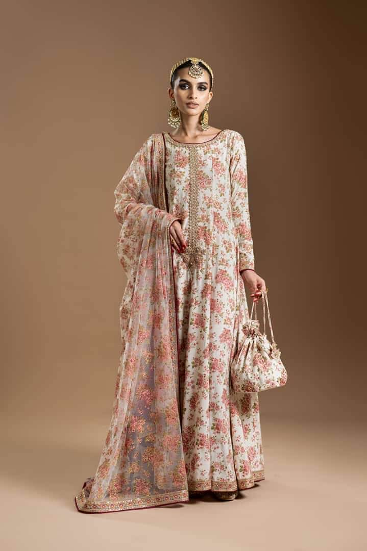 A magnificent ivory screen printed flowy kalidaar with a long heavily embellished neckline using dabka, naqshi, pearl, cut dana, baitki, sequin etc. with our signature chaand baaliyan tassels at back and heavy sequin spray all the way till neckline ending and sleeves, finished with beautiful embroidered borders on sleeves and flare. This article is paired with plain cigarette pants and a mesmerizing screen-printed net dupatta finished with an intricately embroidered sequin borders.