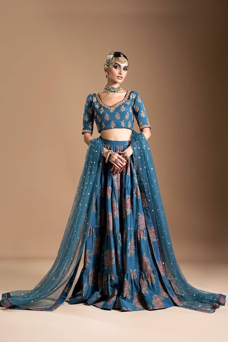 PRODUCT DETAILS 3PC Ready to wear Colour: Teal A stunning screen printed choli with heavily embellished bodice and...