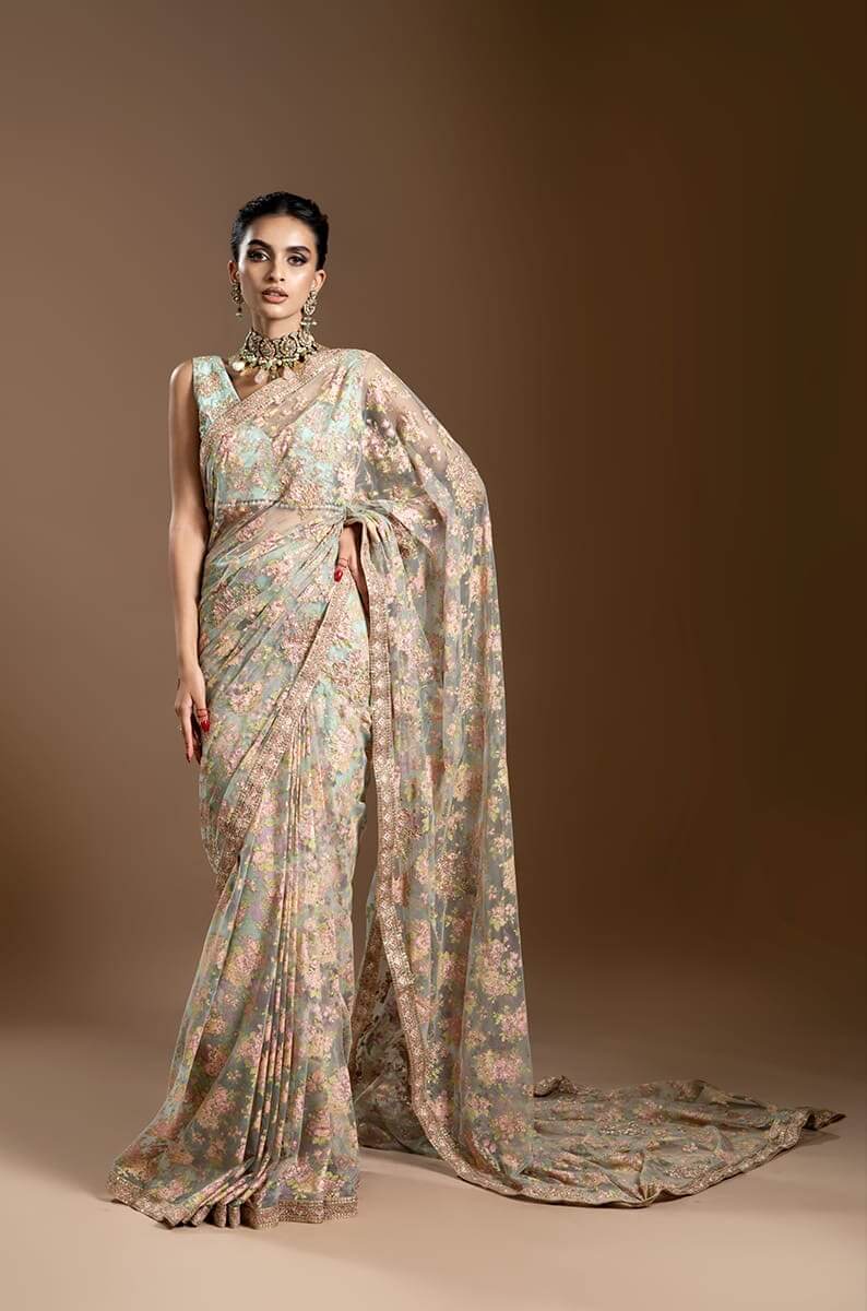 A spectacular pastel hue mint green screen printed net sarree embellished with all over naqshi work, finished with beautiful pastel tone multi-colored embroidered border all round, giving it a beautiful blingy look. Paired with a plain peti coat and screen printed blouse with same blingy naqshi work with addition of pearl hangings all over its waist.