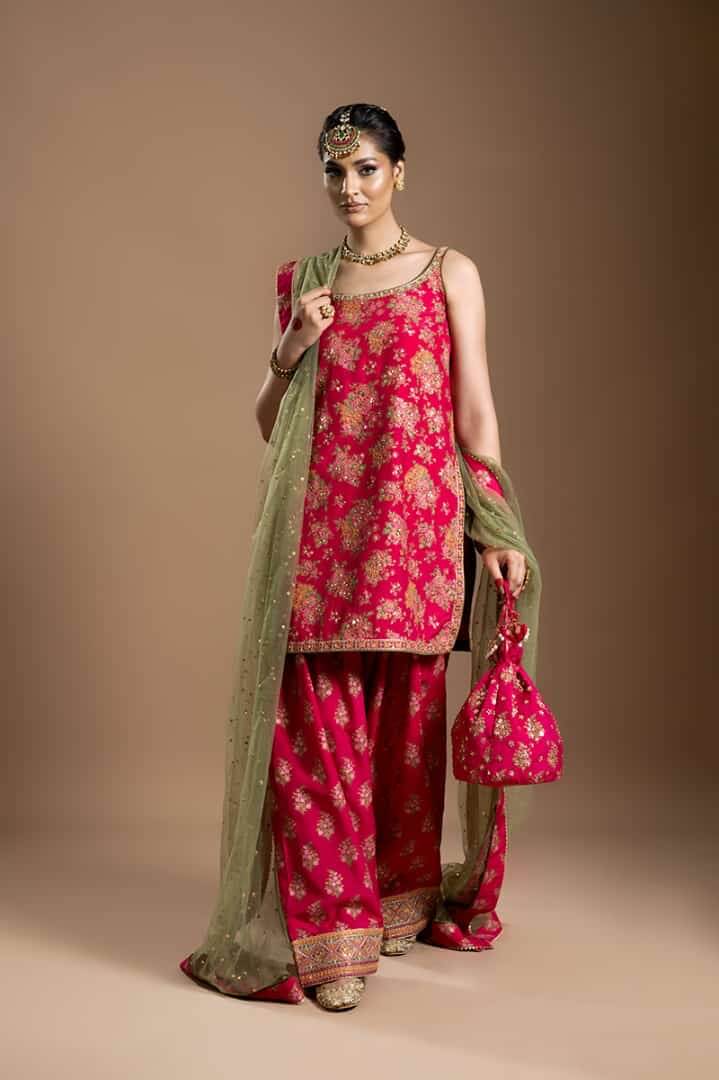 An adorable Shocking pink traditional screen printed ensemble with all over hand embellishment on its neckline, front and sleeves using dabka, naqshi, sequins, beads and resham work, finished with embroidered borders multiplying its beauty. This short shirt is paired with a screen printed traditional shalwar with an intricately embroidered sequin border on its bottom and a heavily sequin sprayed olive green net dupatta with contrast shocking pink printed edgings and kingri lace all around the dupatta.