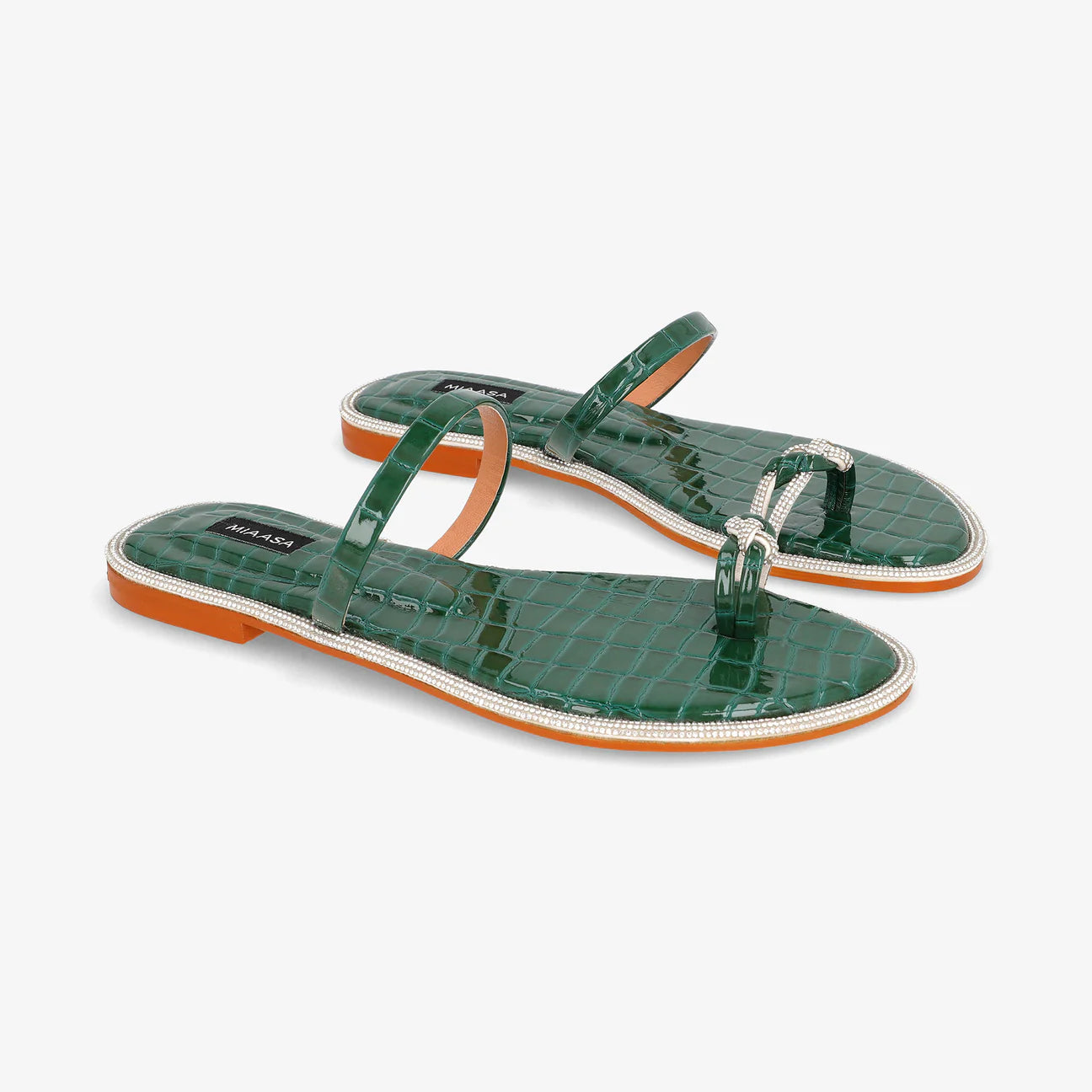 PRODUCT DETAILS Color: Emerald The ‘Azure’ sandal features our signature toe ring, delicately braided with silver crystals...