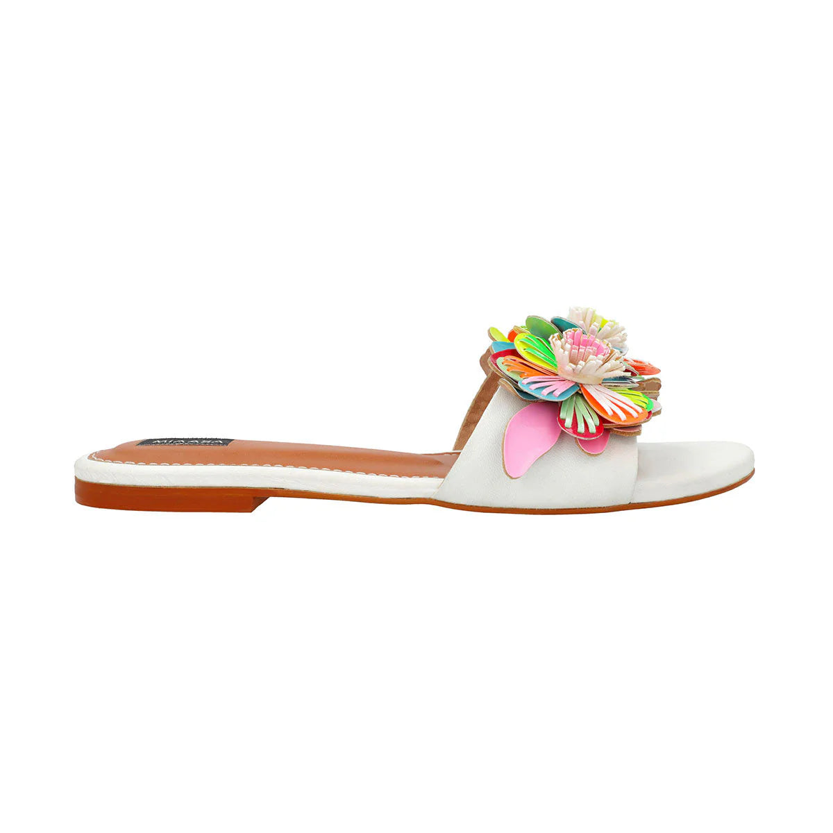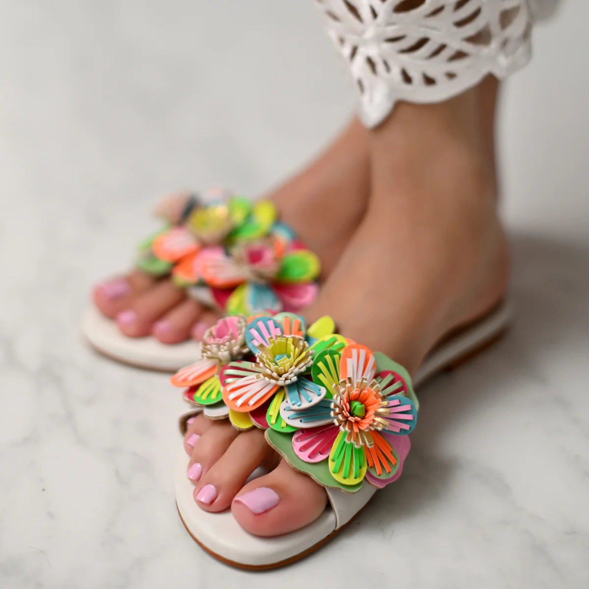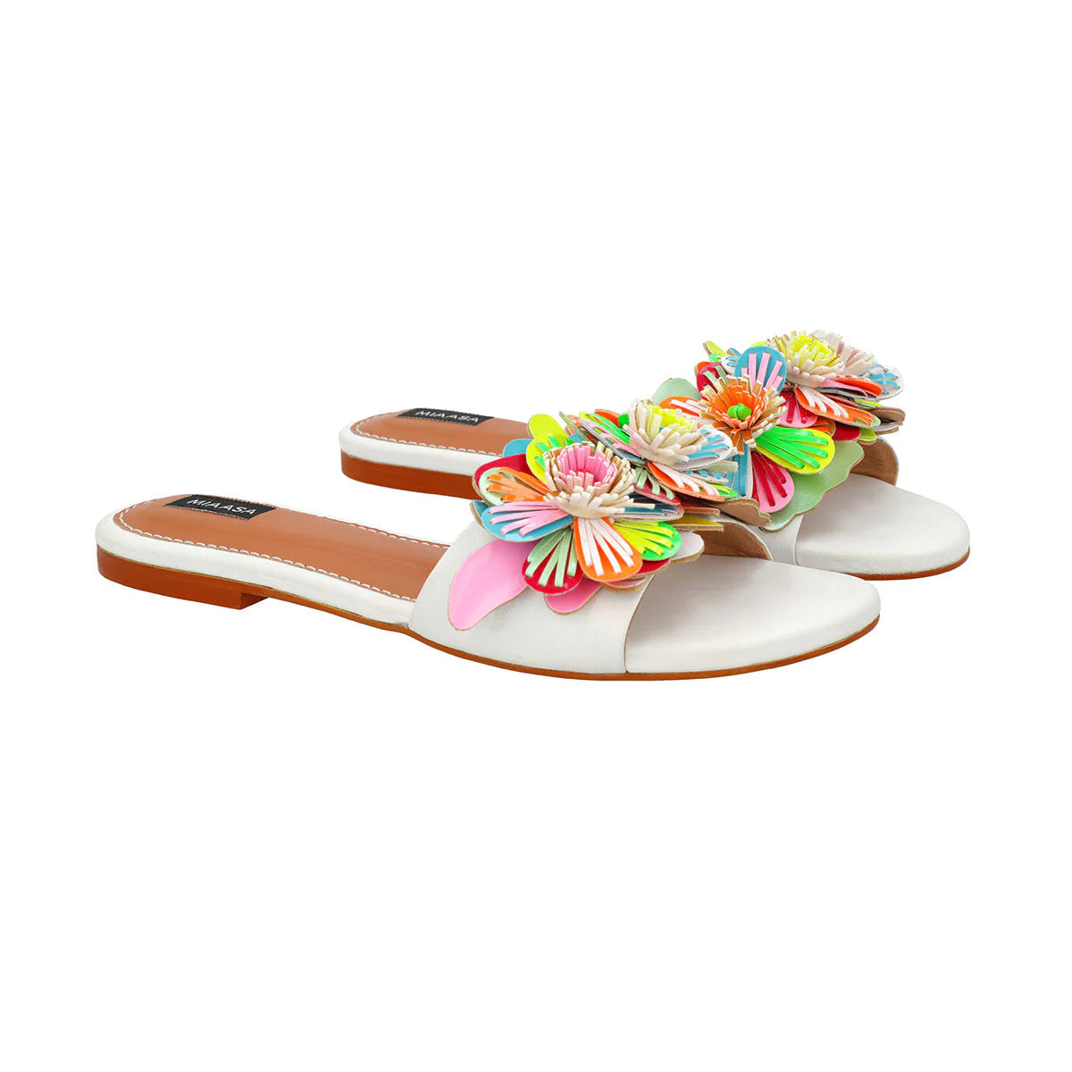 Multi Coloured fluorescent petals, whip stitched by hand, form the florals for the new ‘Nia’ slip-on. This fun and flirty slide in its rainbow glory are sure to be your next wardrobe stand-out piece.