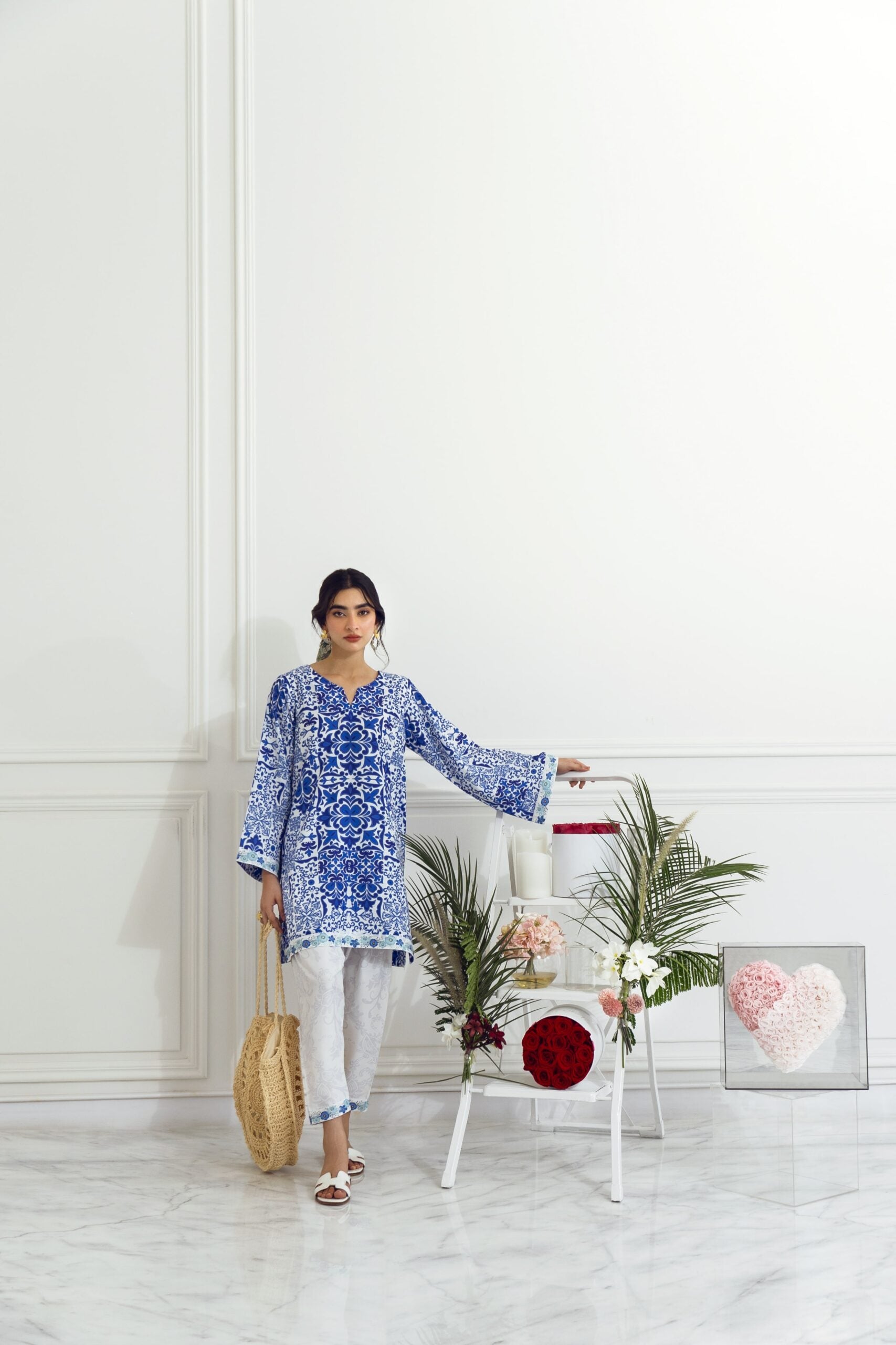 Introducing Ferozeh from our upcoming “Khushi ki Misaal” lawn pret collection. A vibrant blue printed co-ord set features monotone florals on the shirt paired with a white tapered shalwar with a thin floral border.