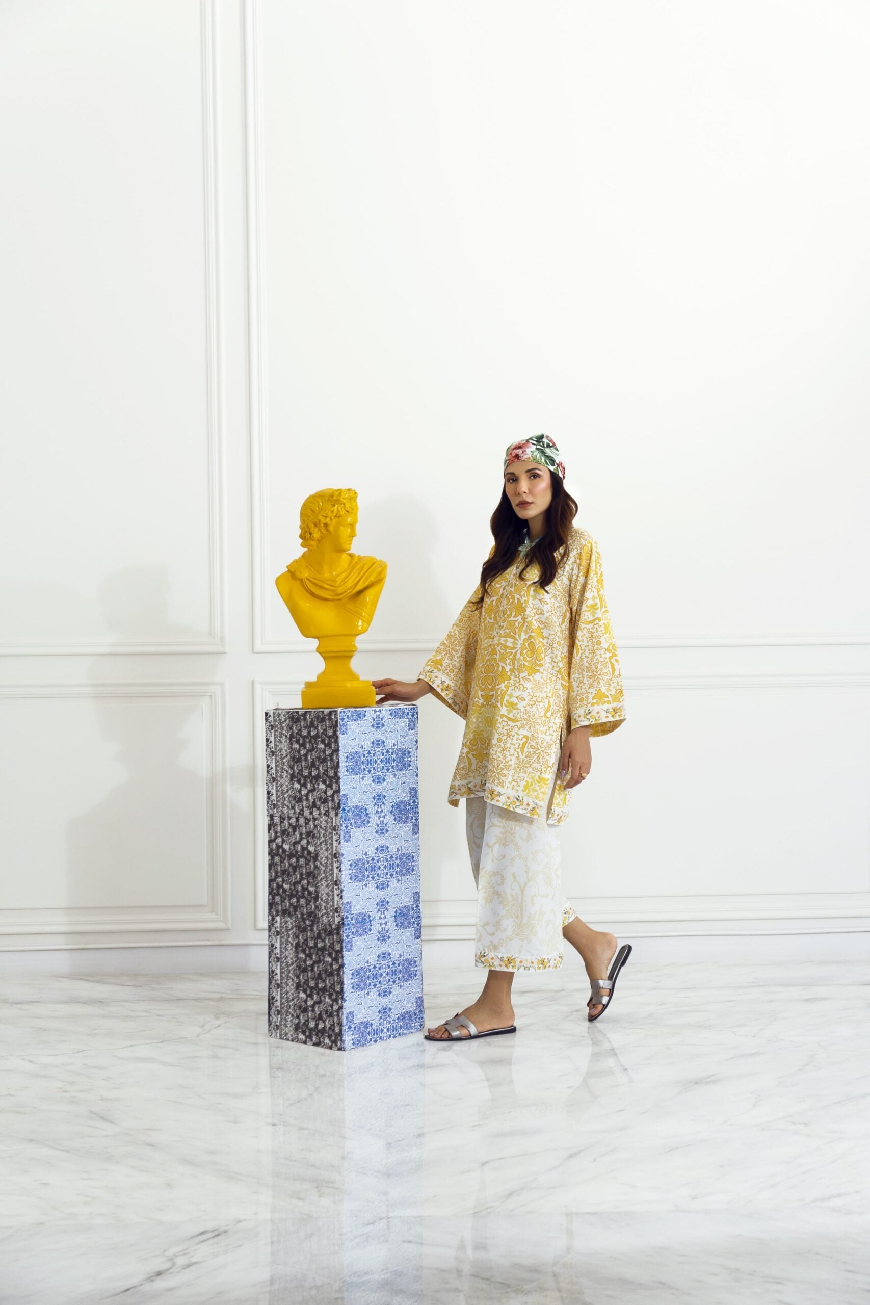 Introducing Kiran from our upcoming “Khushi ki Misaal” lawn pret collection. A vibrant yellow co-ord set features a fresh summery floral shirt with wide legged culottes.
