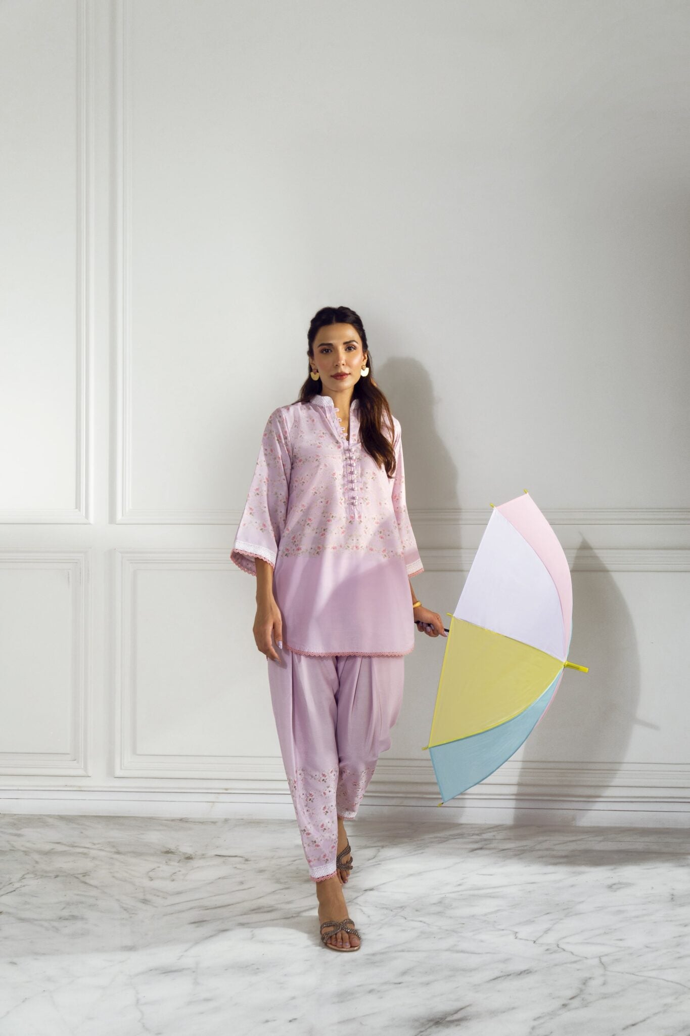 Introducing Mehek from our upcoming “Khushi ki Misaal” lawn pret collection. A subtle pastel hued canvas with buttons on the neckline and lace trimmings.A band collar with a slit revolves around a serene vibe and is paired with a shalwar to be the perfect summer wear choice.