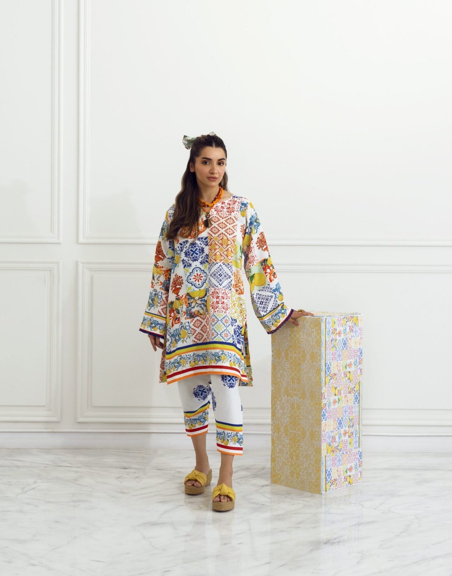 Introducing Roshni from our upcoming “Khushi ki Misaal” lawn pret collection . A well-suited summer outlook with a bright tropical print straight cut shirt featuring block patterns along with a printed shalwar that truly set a misaal.
