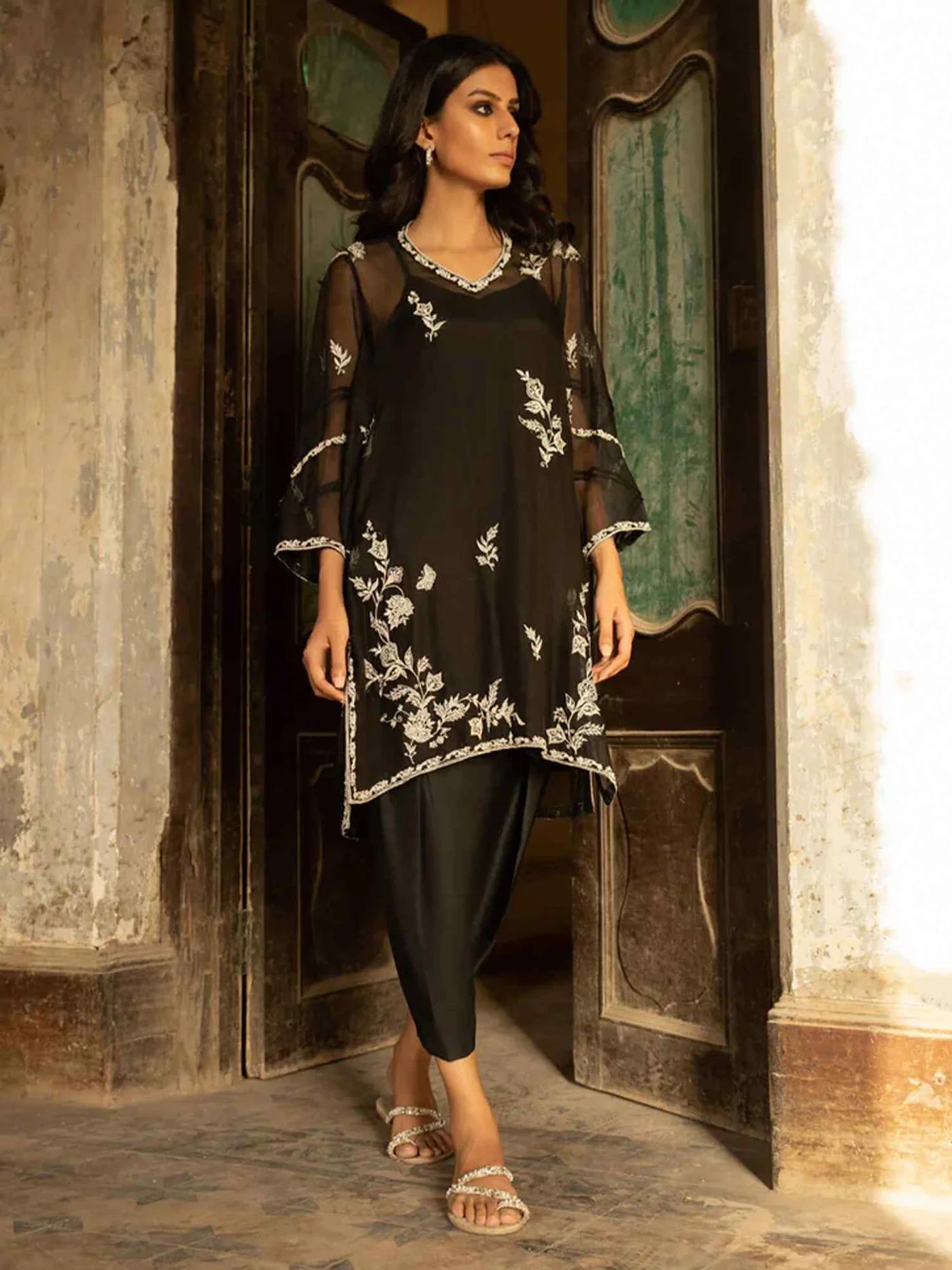 Our hand-crafted Alisha kurta is cut from black spun net and shows off the designer’s mastery of embellishments. This subtly sophisticated style is a masterpiece in person and will be your go-to for an effortlessly elegant look.
