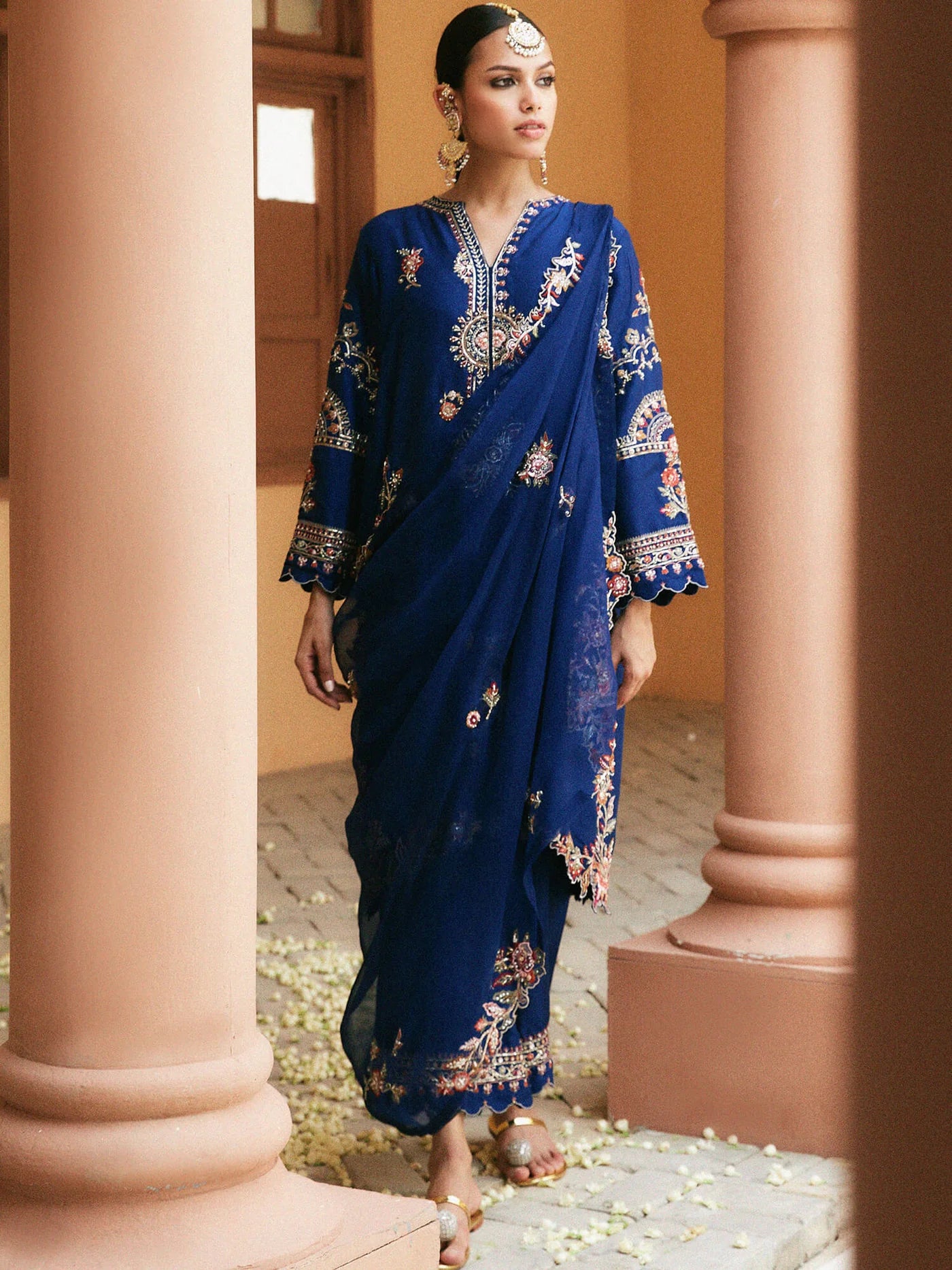 A fresh take on a classic silhouette – our Alisha kurta in a rich cobalt blue is hand embroidered using traditional techniques that fuse resham and zardozi work in modern way. It is styled with a a matching izaar and embellished draped dupatta – a must-have piece that can be easily dressed up or down.