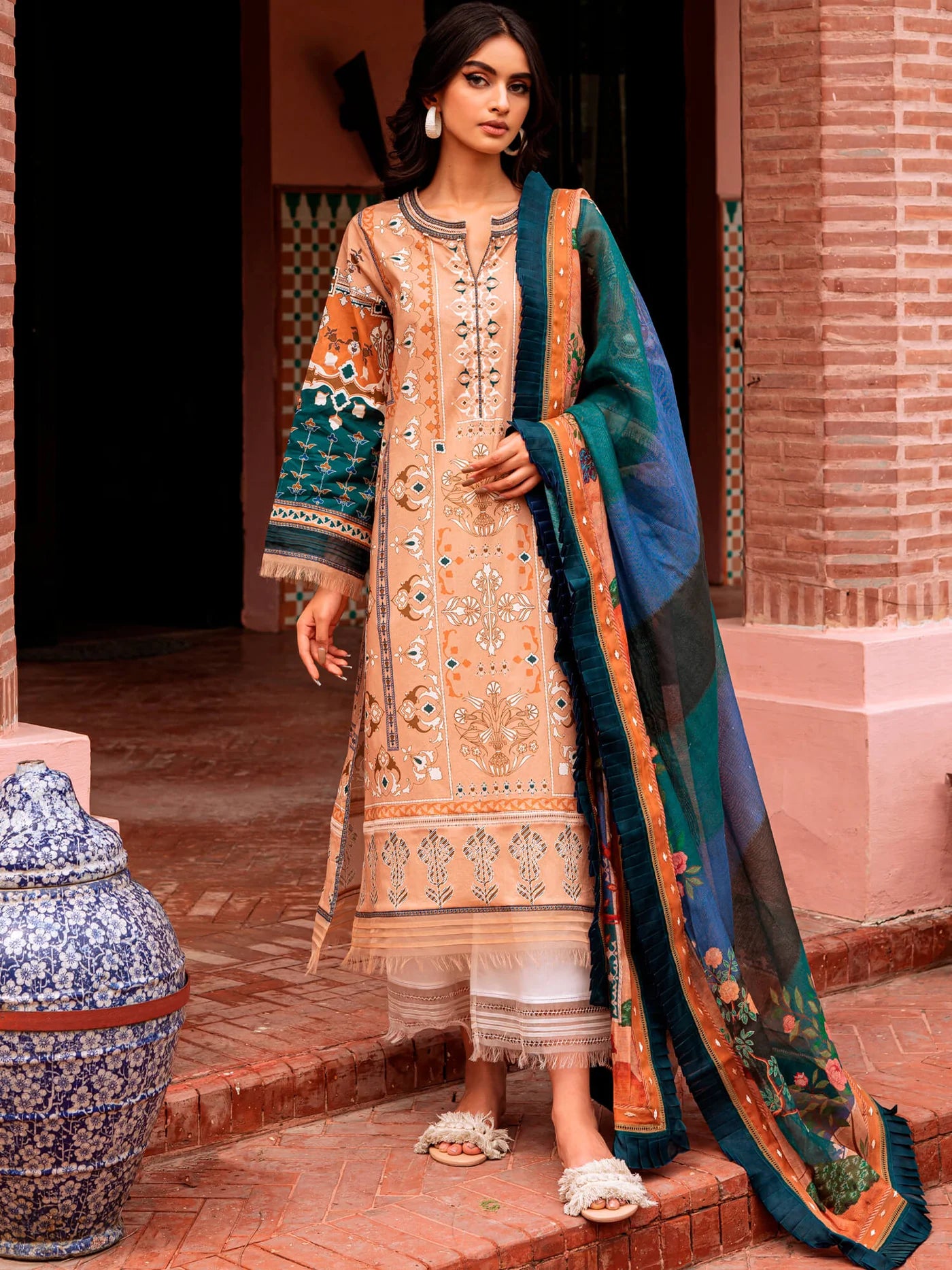 Crafted from lawn, the “Zahra” in a soothing latte hue is a must-have for summer. Featuring detailed Turkish motifs in contrasting hues of olive, ivory and teal, and teamed with a contrasting spun-net dupatta in navy and black, it’ll take you seamlessly from your desk to dinner and comes with complementing ivory pants.