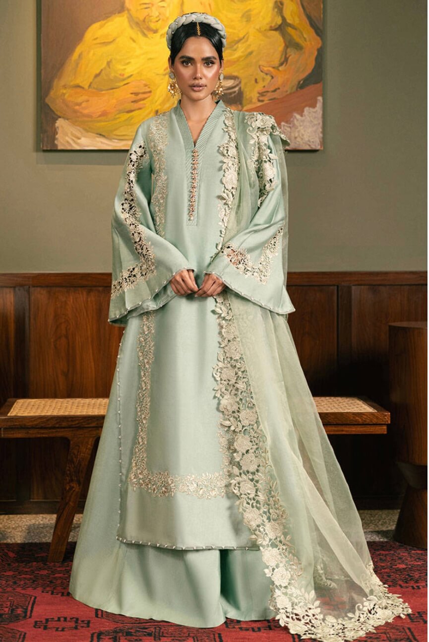 PRODUCT DETAILS 3PC Ready to wear Color: Pale Sage Fabric: Cotton Net Work Details: Embroidered Embrace the...