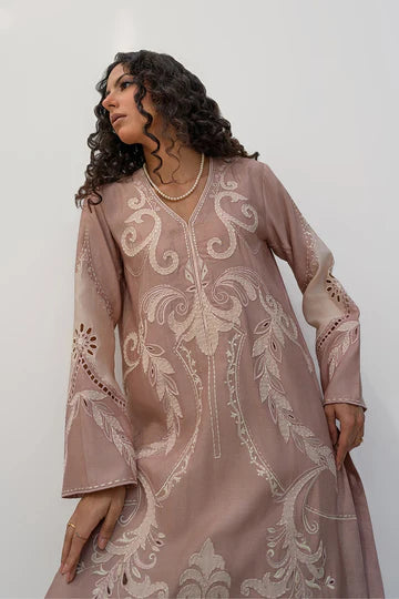 Embodying a soft, poetic charm, this blush khaadi silk ensemble is defined by a breezy long shirt, delicately embroidered in tonal resham with subtle hints of ivory. Playful appliques fringe the daman & sleeves, adding movement and character. Finished with a refined V-neckline and paired with breezy lace detailed culottes, the monochromatic look feels whimsical yet oozing grace.