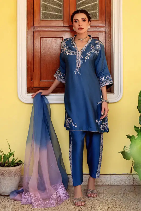 Redefine sophistication and chic look with our Nazli set. Perfect for casual chic evenings, this khaadi silk shirt features intricate embroidery in subtle hues along the neckline and sleeves. Embroidery along the shalwar sides further enhances the outfit. Pair it with a two tonal dupatta for a polished look.