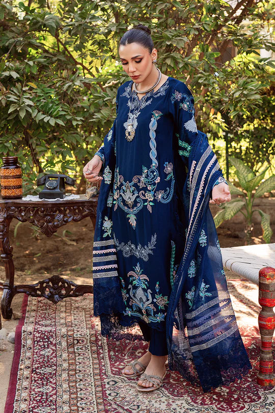 Pernia’ exudes effortless luxury, with its cascading block printed dupatta and and a sweeping khaadi silk shirt. This navy blue canvas is exquisitely embroidered with intricate applique, resham & cutwork. Pair it with a matching pant for a classy look.