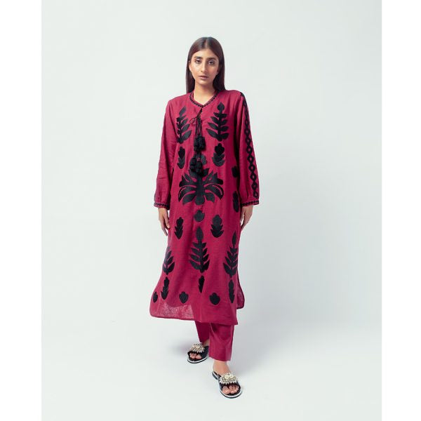 PRODUCT DETAILS Kurta One piece Color: Maroon Work details: Aari embroidered Fabric: Linen Matching pants can be...