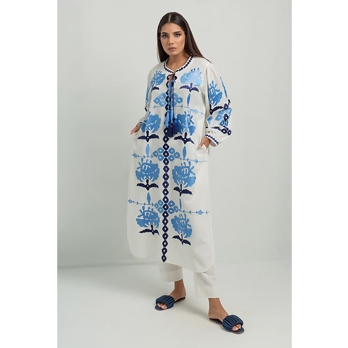 PRODUCT DETAILS Color: White/Blue Fabric: Linen Work details: Aari embroidered Matching pants can be added on an...