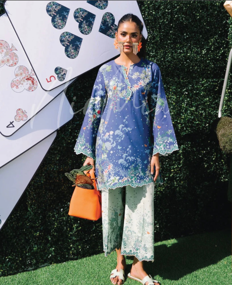 Introducing ‘Midnight’ from our Lawn Vol 1 2025 collection – a showstopper in every sense! This beautifully crafted outfit showcases a delicate print of leaves and butterflies on premium prima lawn, highlighted by a cutwork neckline adorned with dainty butterflies for that extra touch of elegance. The straight kameez paired with chic culottes creates a look that’s both modern and timeless, making it the perfect addition to your wardrobe.