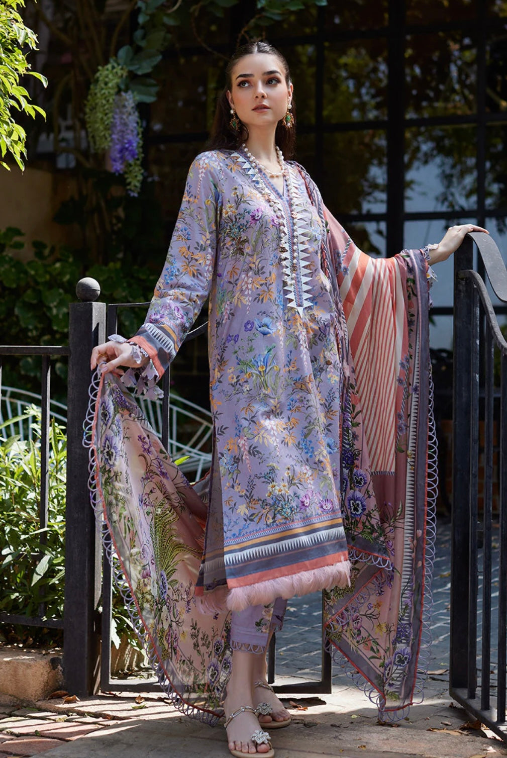 This exquisite ensemble draws inspiration from the tranquil allure of botanical gardens, draped in a captivating shade of lilac. Comprising matching printed pants and a pure printed silk dupatta adorned with meticulous detailing, it exudes an enchanting elegance that effortlessly completes the ensemble.