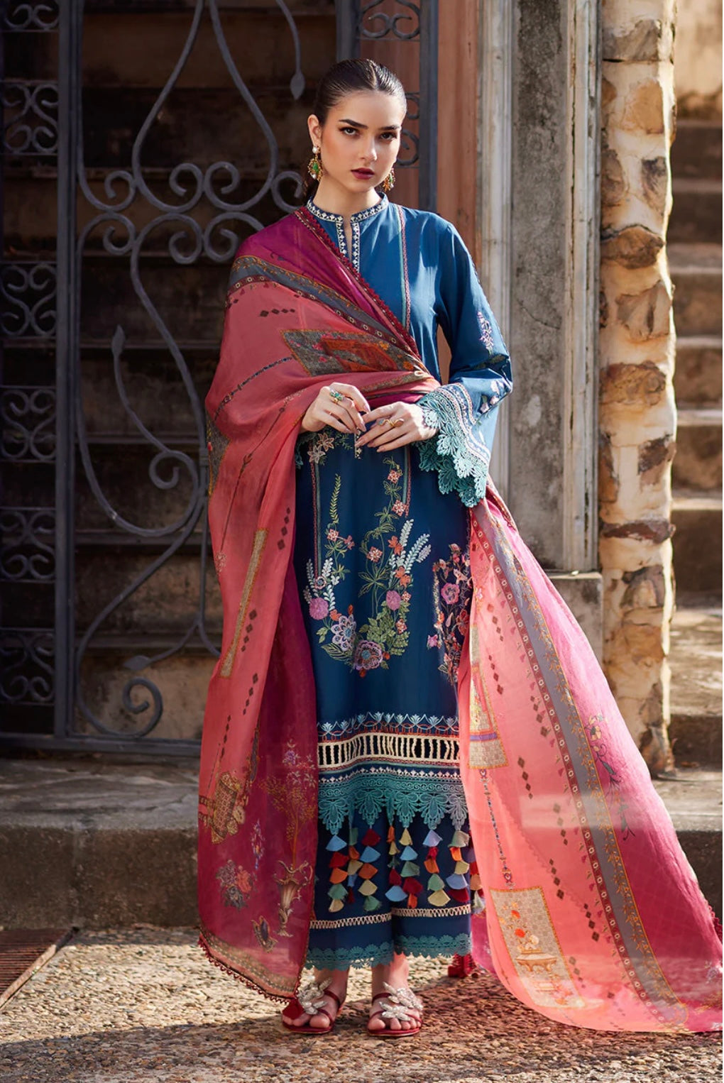 This exquisite lawn embroidered shirt showcases vibrant blooming florals elegantly layered atop a rich navy base. Paired flawlessly with a diaphanous silk dupatta boasting a captivating geometric pattern in vivid hues, this striking ensemble seamlessly transitions from day tonight, ensuring effortless elegance throughout.