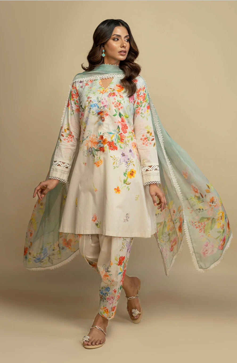 Indulge in elegance with our printed co-ord set, crafted from pure cotton and inspired by the delicate beauty of French watercolor florals. This ensemble captures the essence of romance and sophistication. Paired harmoniously with a complementing printed chiffon dupatta, adorned with delicate lace tassel detailing, this ensemble offers a graceful and refined statement of style