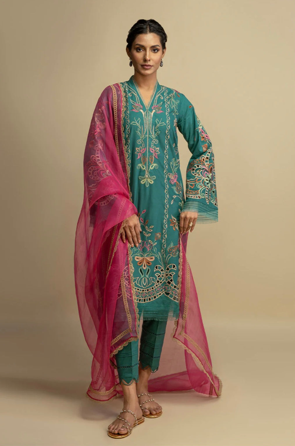This ensemble boasts intricate cutwork embroidery on a rich deep green base, accentuated by complementary hues, creating a visually stunning and harmonious composition. Paired elegantly with a contrasting dupatta, finished with delicate lace detailing, this outfit exudes refined elegance and timeless charm.