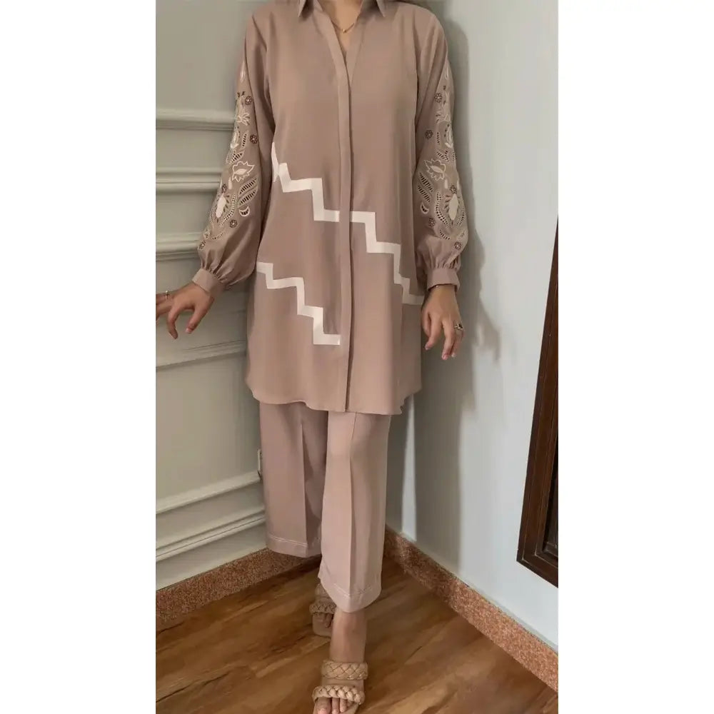 PRODUCT DETAILS 2PC Ready to wear This Mocca Beige Set features fully embroidered , applique and cutwork...