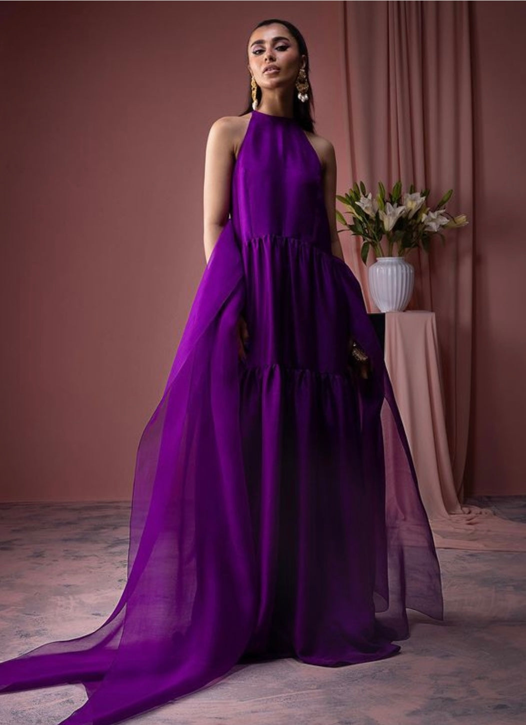 PRODUCT DETAILS 2Pc Ready to wear Color: Purple Fabric: Grip Silk Halter neck tiered shirt made out of pure...