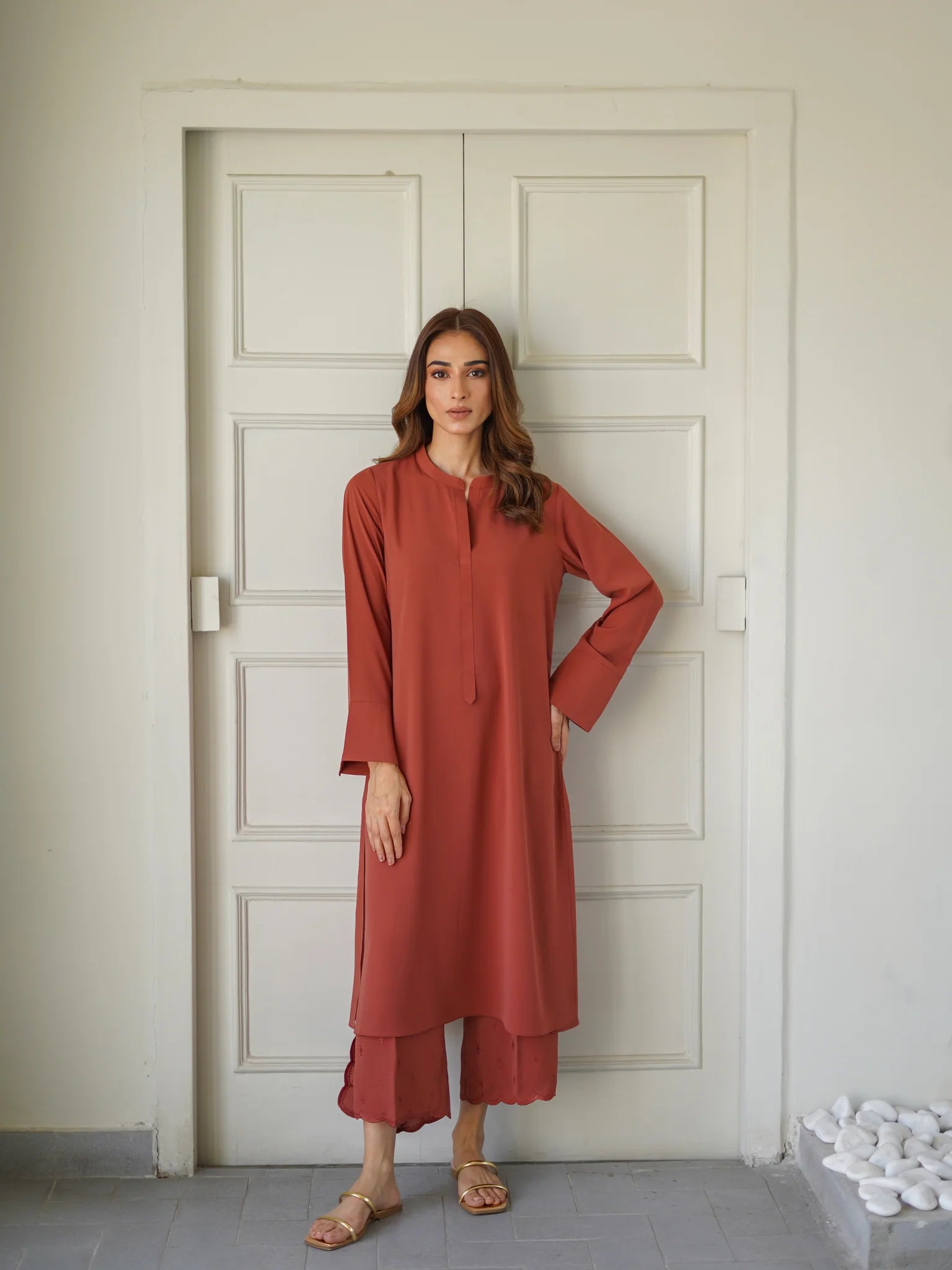 PRODUCT DETAILS  2Pc Ready to wear Color: Rust Fabric: Crepe comes as a two-piece set (shirt and...
