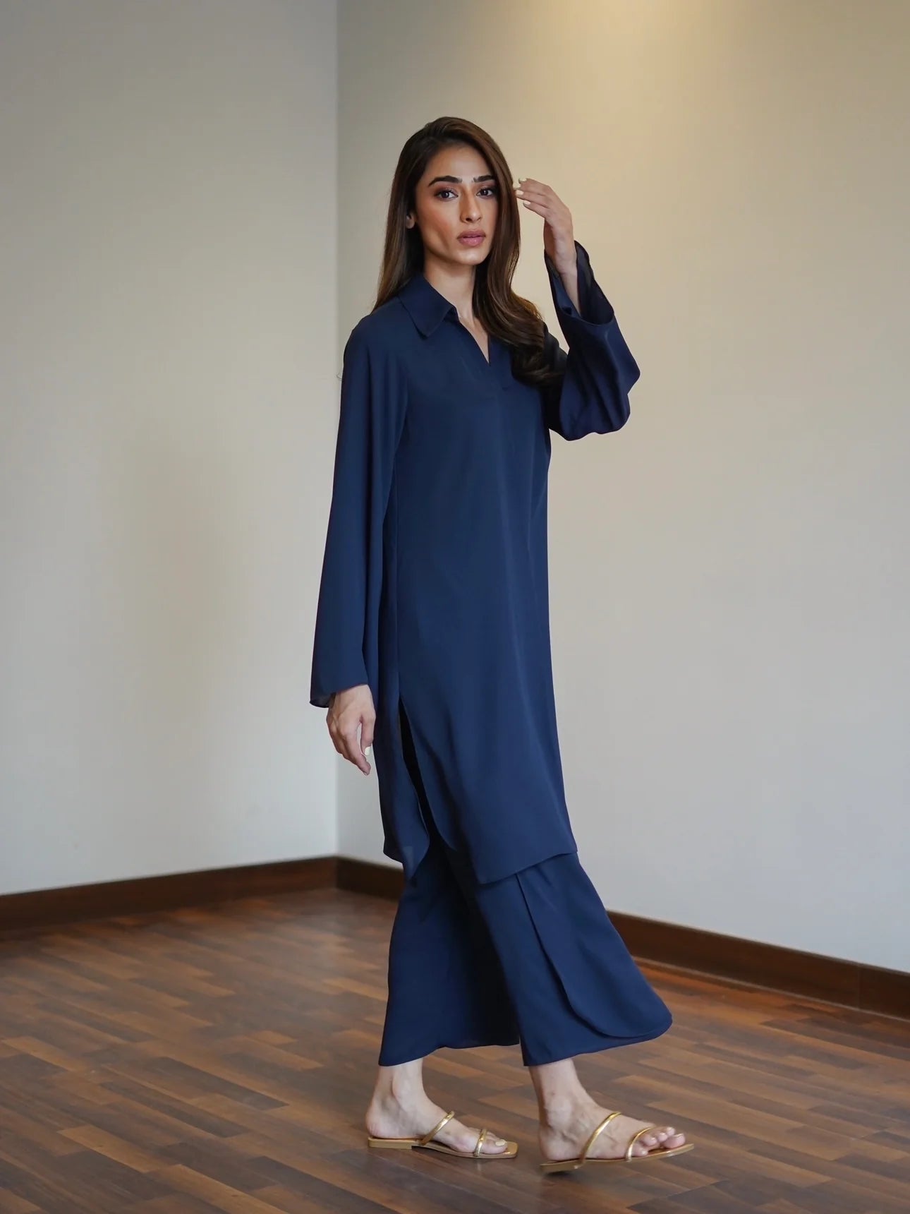 PRODUCT DETAILS 2Pc Stitched Set Color: Navy Blue Fabric: Crepe Comes as a two piece set,Shirt & Culottes...