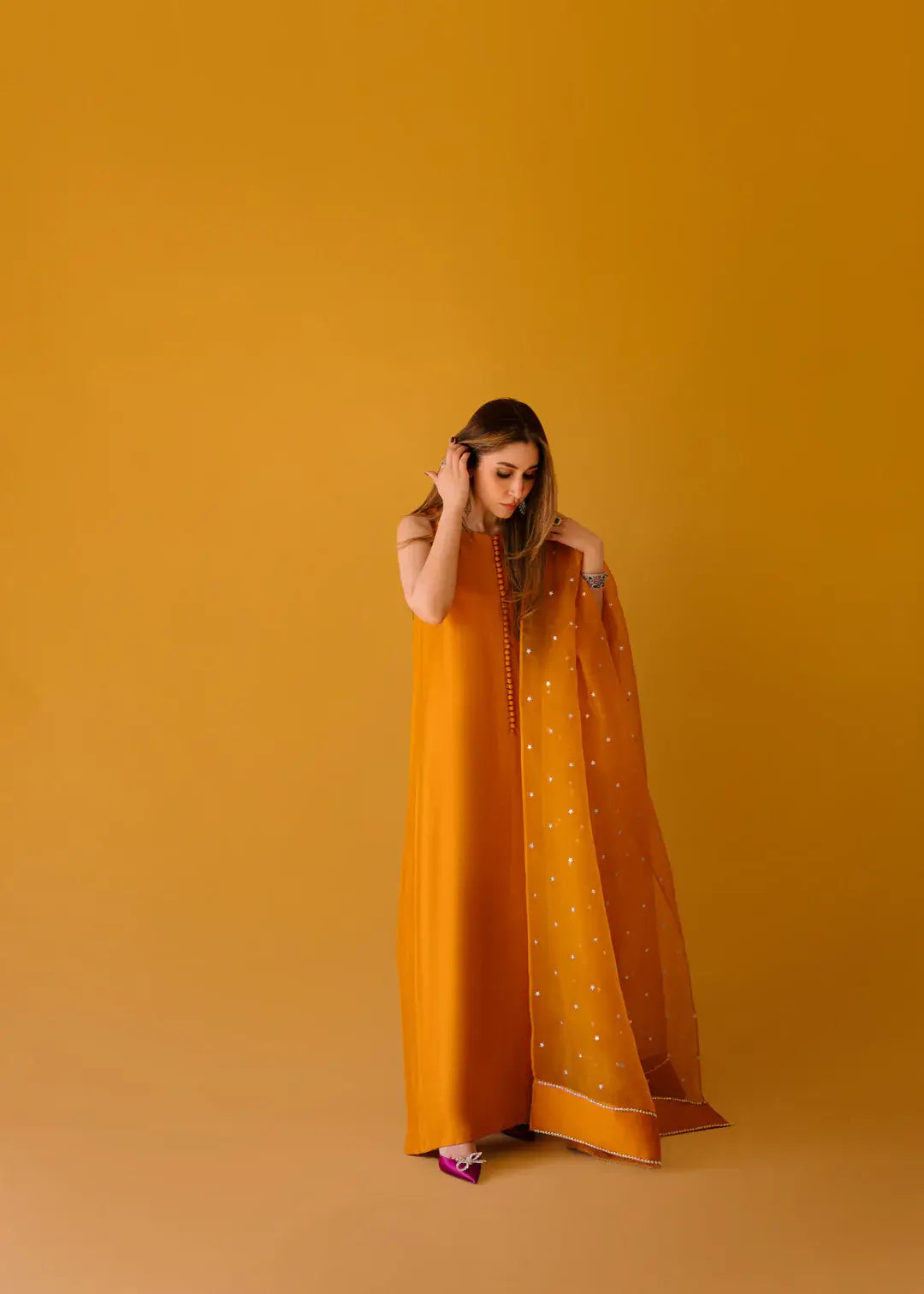 A gorgeous 80 gms pure rawsilk burnt orange long maxi with button detailing and paired with a pure organza fully hand embellished dupatta. Rhinestones and sequins spray all over the dupatta. Paired with pure rawsilk 80 gms cigarette pants