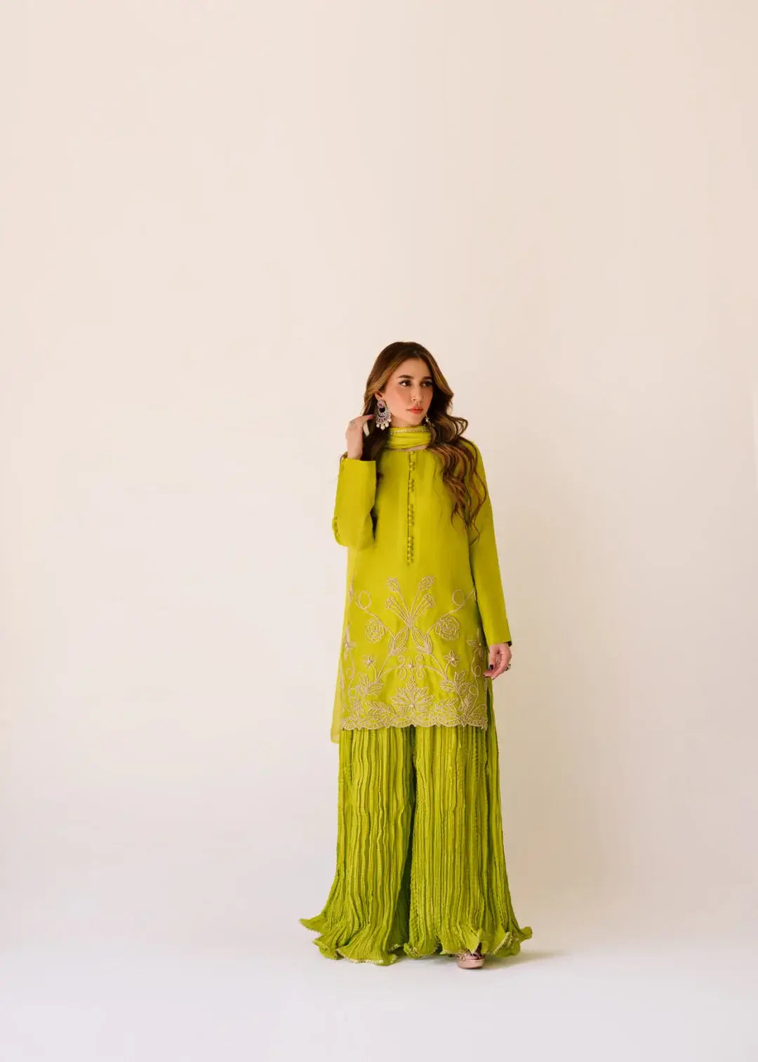A lime green pure Korean silk shirt full of Dori work, cut daana and pearls. Paired with a medium silk dupatta and crushed gharara.