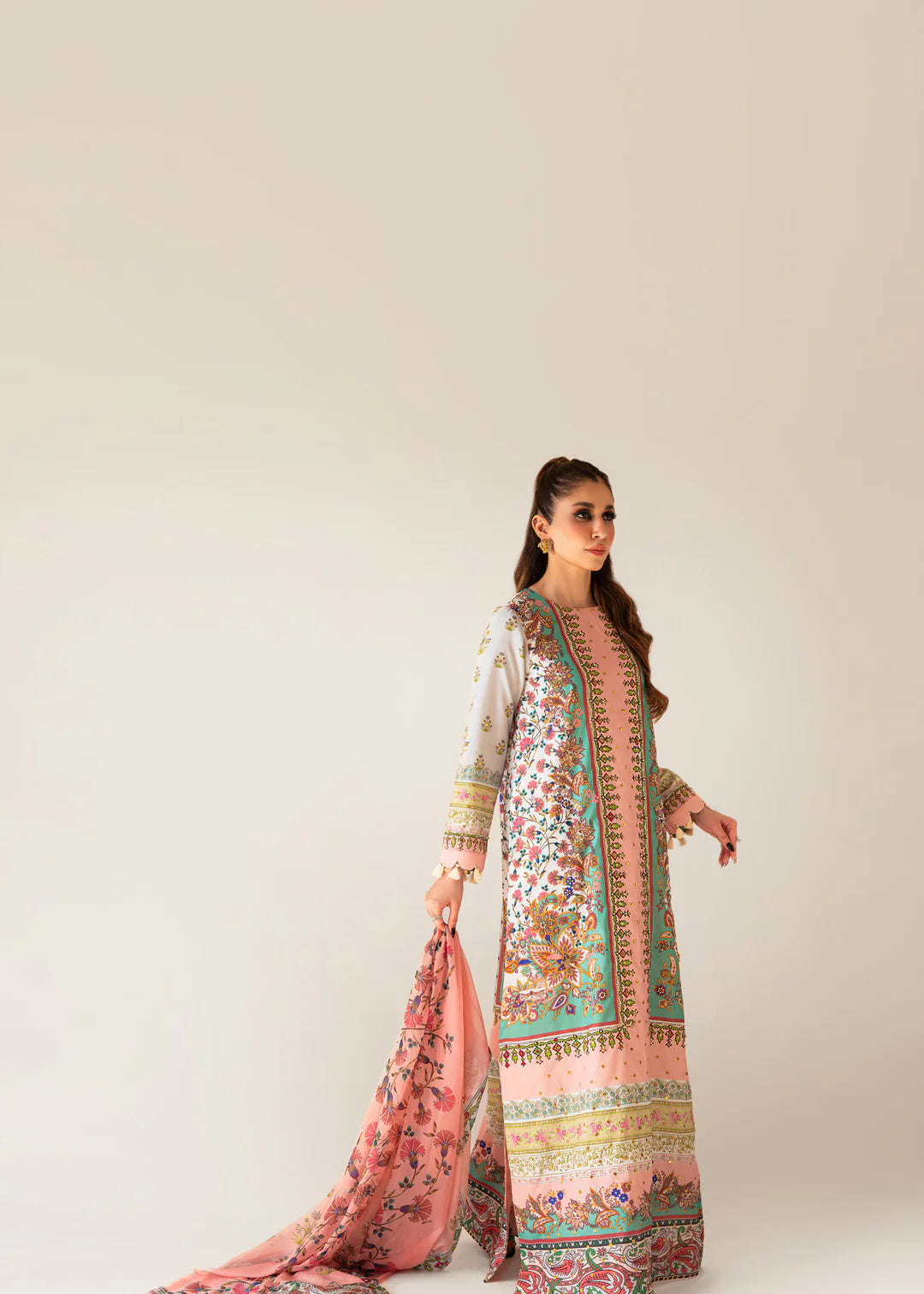 A Digital print grip long shirt with hand embellishments of gota, kora, dabka , rhinestones and pearls all over. Tassel detailing on sleeves. Printed grip culottes and chiffon Digital print dupatta with gota finishing.