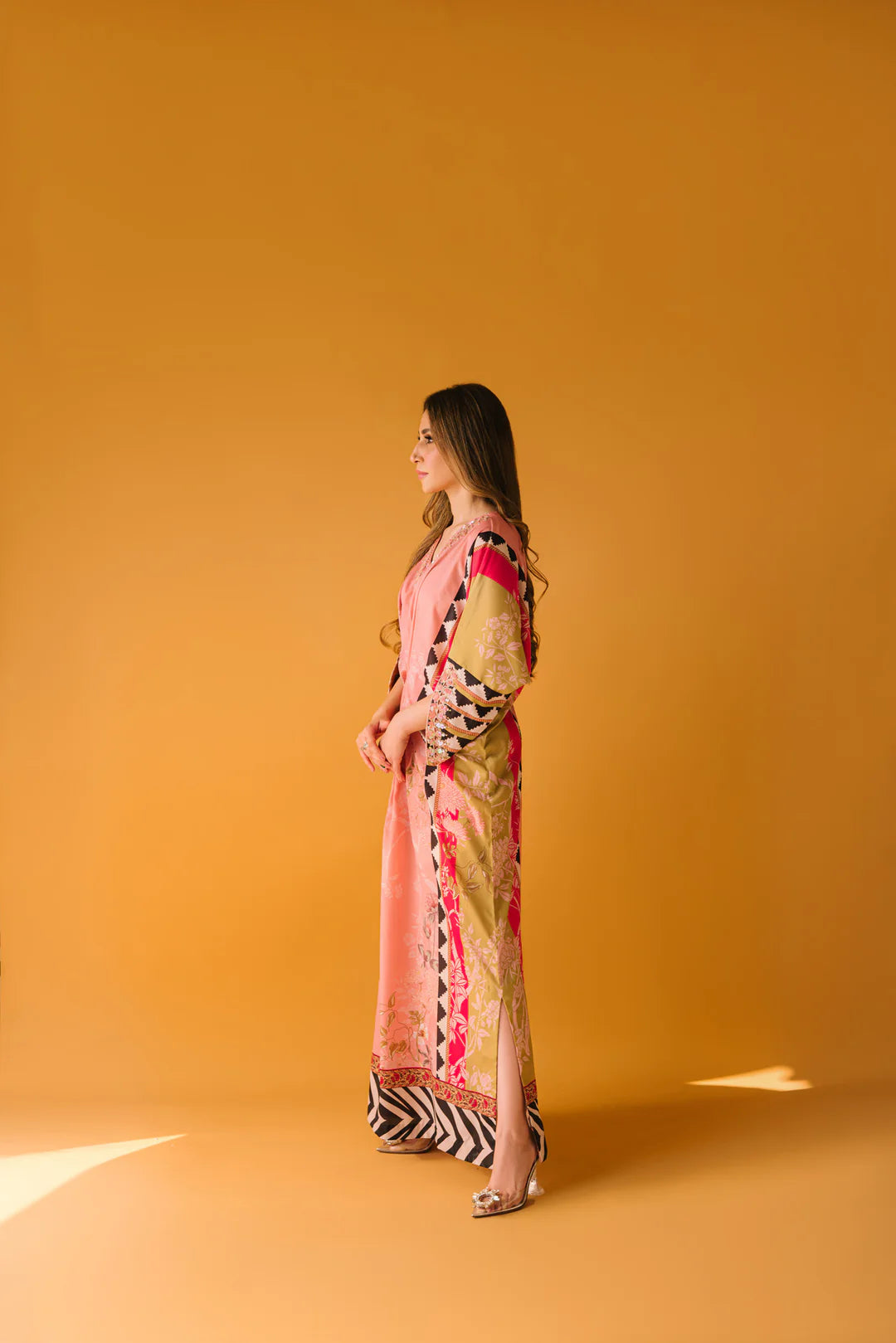 A grip silk digitally printed caftan with super pretty and intricate hand embellishments on neckline and sleeves. Sequins, cut daana and resham.
