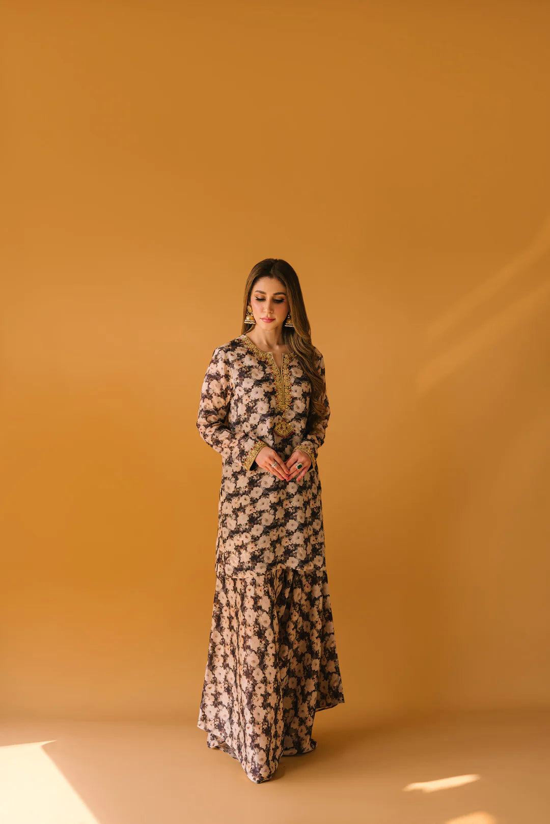 A pure Korean silk digitally printed shirt and high low flared pants. Kora, dabka, maroon synthetic stones and gota embellishments on neckline and sleeves.