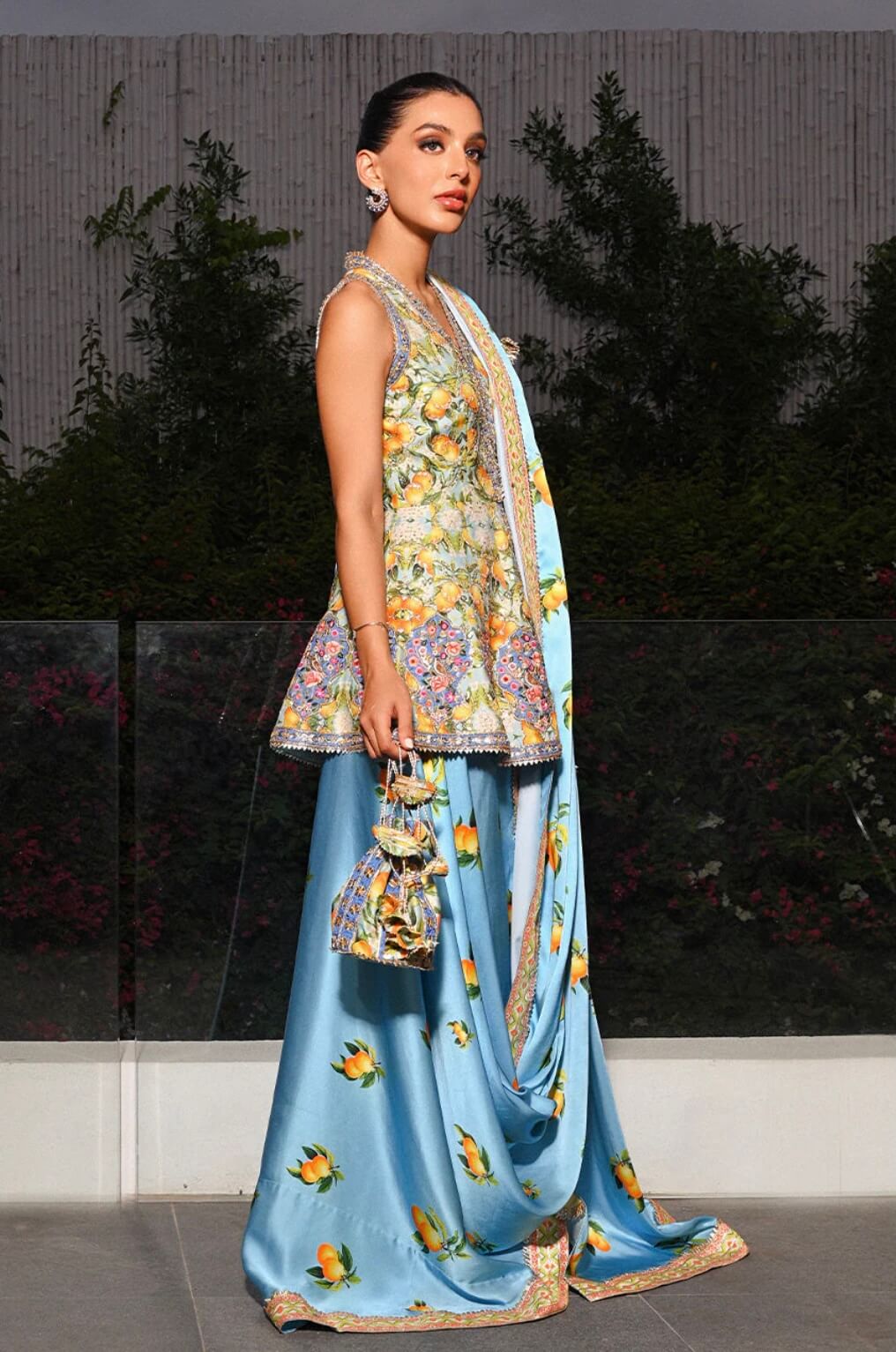 Regal meets contemporary in a sky blue, khaddi silk and charmeuse pre draped sari elevated with a playful lemon print and contrasting border. The charmeuse sari drapes like a dream and when paired with a khaddi silk peplum top, it embodies our ethos of integrating theatrics with effortless style. The peplum top features a striking lemon print with embroidered bird motifs and gota details complemented by an applique border.
