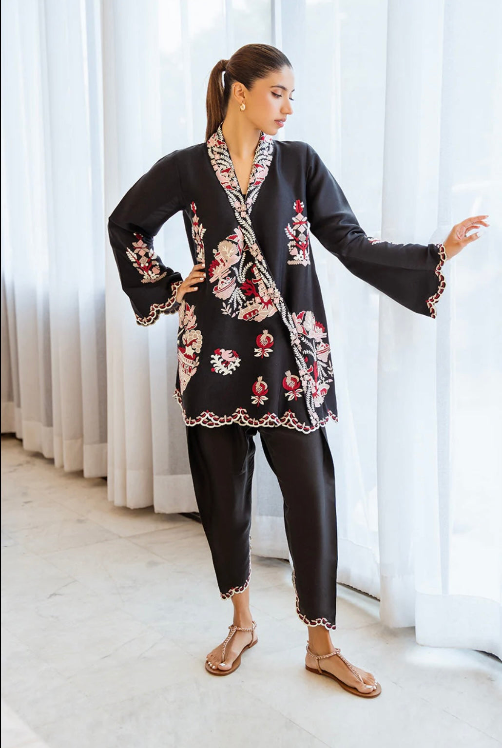Mystical oriental elements combined with the workmanship of aari embroidery make this ebony pure rawsilk wrap-around jacket a statement piece for every season. The embroidered jacket with scalloped hemline and sleeves is complemented with matching pure rawsilk tapered shalwar and a slip.