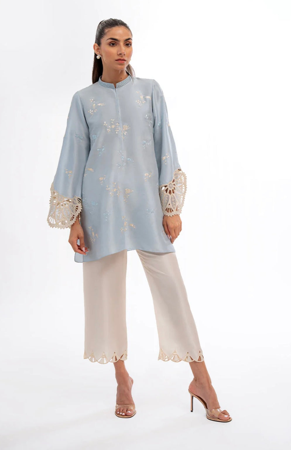 A relaxed silhouette cut from rawsilk, this sky blue shirt is adorned with delicately embroidered floral motifs with a pleated collar. Complemented with embroidered detailing on the fan shaped sleeve cuffs, the shirt is paired with cream rawsilk culottes featuring a cutworked hem.