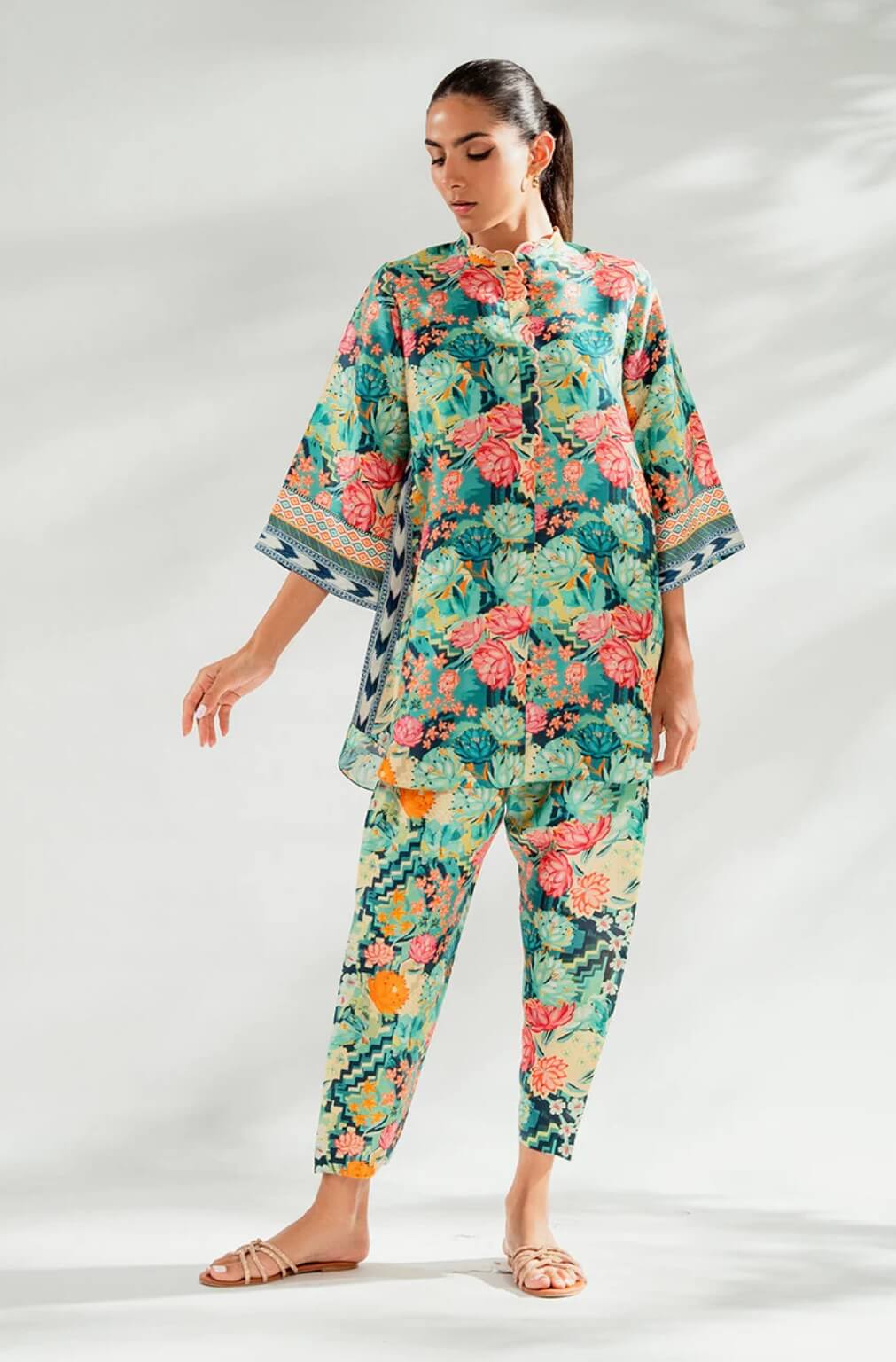 A pure rawsilk co-ord set in striking shades of green, with pops of salmon pink and tangerine, is designed to make you feel comfortable, beautiful, and confident. The maximalist approach with the floral print is perfect for those who wish to stand apart.