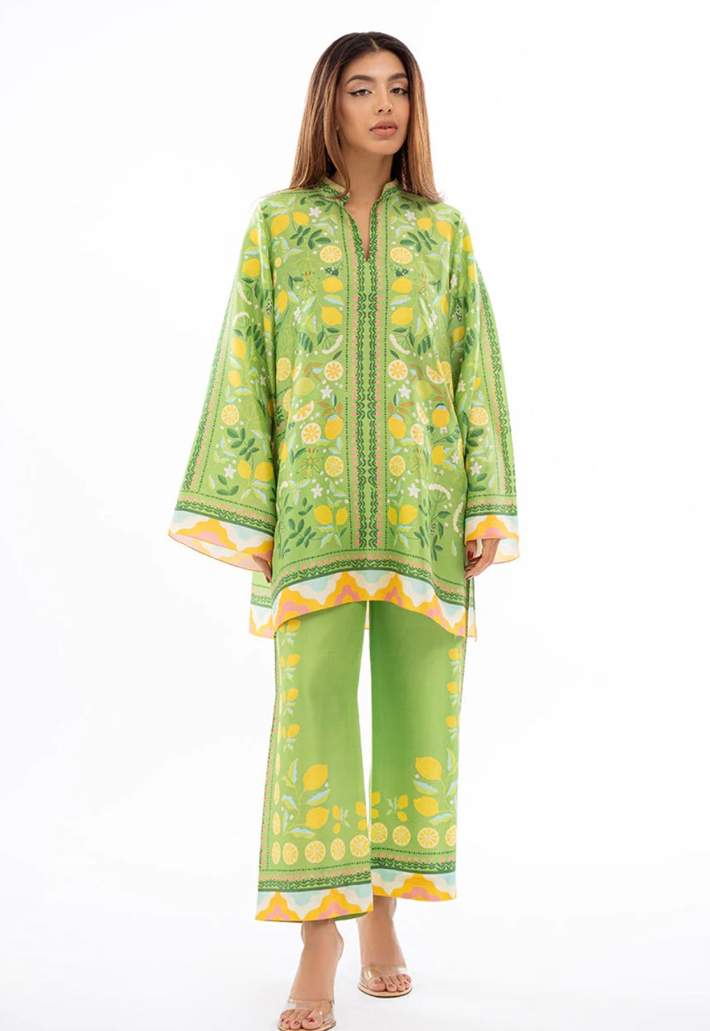 A playful fusion of lemon and florals takes centre stage on this shamrock green co-ord set cut from pure rawsilk.