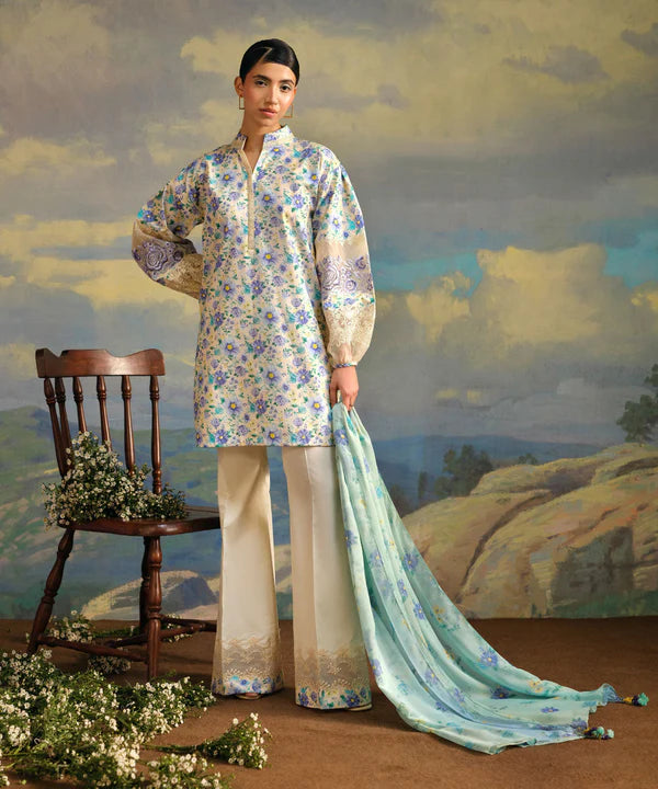 Immerse yourself in blooming florals with our off white and blue three-piece embroidered suit featuring a lawn shirt, blended tissue dupatta and cambric pants.