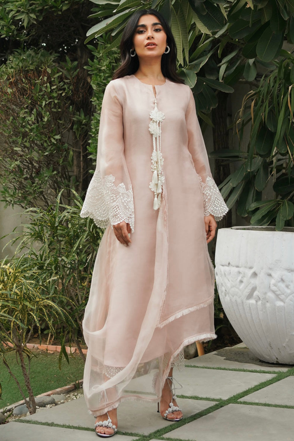 Step into elegance with a pink pure organza lined shirt featuring a pleated cut. The neckline is adorned with handmade thread pearl and floral tassels, complemented by meticulous thread finishing throughout the shirt. Embroidered cutwork appliqué border graces the sleeves, creating a sophisticated and stylish ensemble.