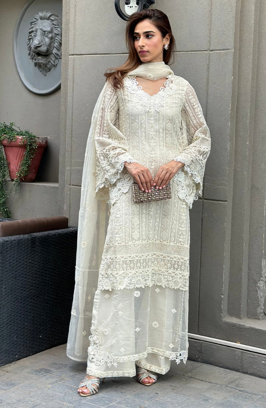 PRODUCT DETAILS 3PC Ready to wear Color: Off White Fabric: Cotton Net Work Details: Embroidery Self embroidered...