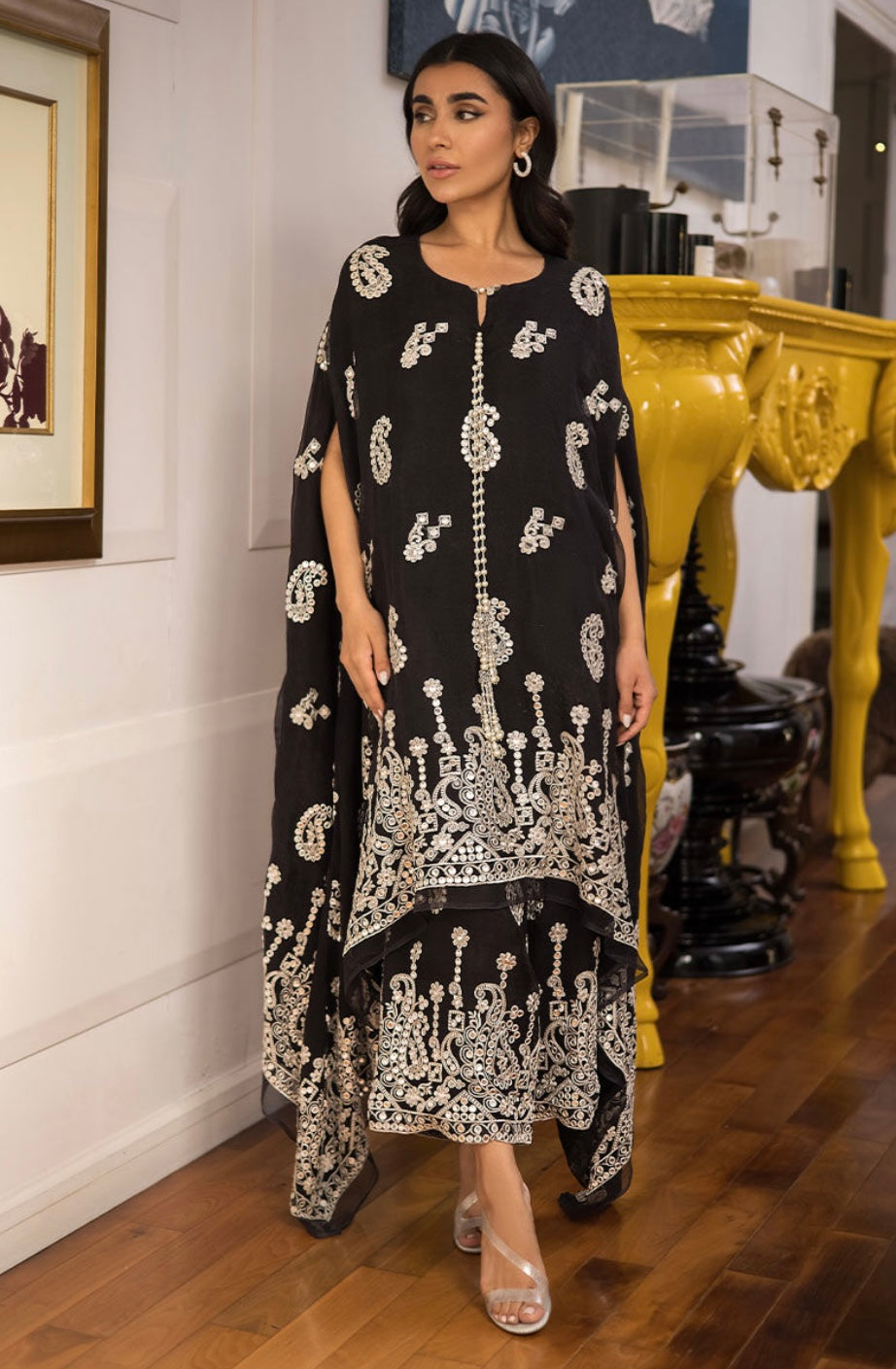 Create a phenomenal look for your most cherished and memorable occasions. Sylvia is a black pure organza cape cut with attached cotton silk lining with thread and mirror foil work all over. Handmade pearl tassels hanging at the neckline with pure organza thread foil mirror work pants. This truly exquisite ensemble is a sure head-turner this festive season.