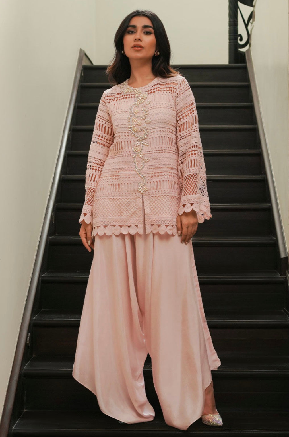 Elegance in every thread: A pink lace cutwork shirt with a handmade pearl-worked neckline, delicately appliquéd for a touch of grace. Paired seamlessly with Pakistan raw silk shalwar pants, this ensemble epitomizes sophistication with a modern twist.