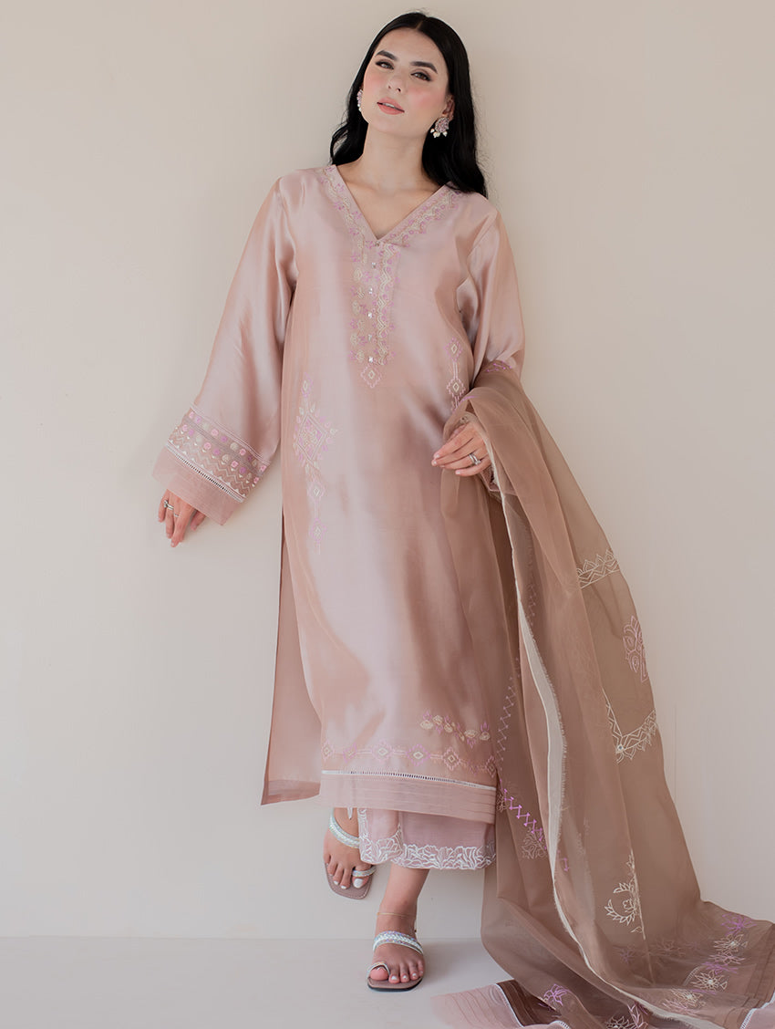 PRODUCT DETAILS Colour : Nude Pink Shirt Pure Kora Silk Culottes Capri Dupatta Pure organza embroidered Slip...