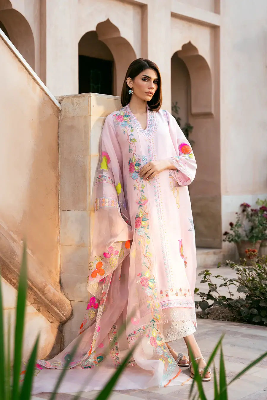 S H I R I N , is a stunning piece with beautiful tailoring and flattering cuts, perfect for both brunches and dinners. The intricate embroidery adds an elegant touch, while the mirror work creates a captivating sparkle. Vibrant appliqués bring a lively pop of color, making this outfit a fabulous choice for the festive celebrations