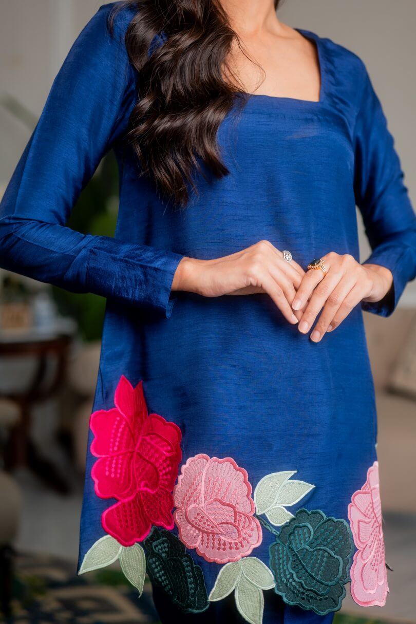 PRODUCT DETAILS 2Pc Ready to wear Colour: Blue Fabric: Silk Work details: Appliqué work