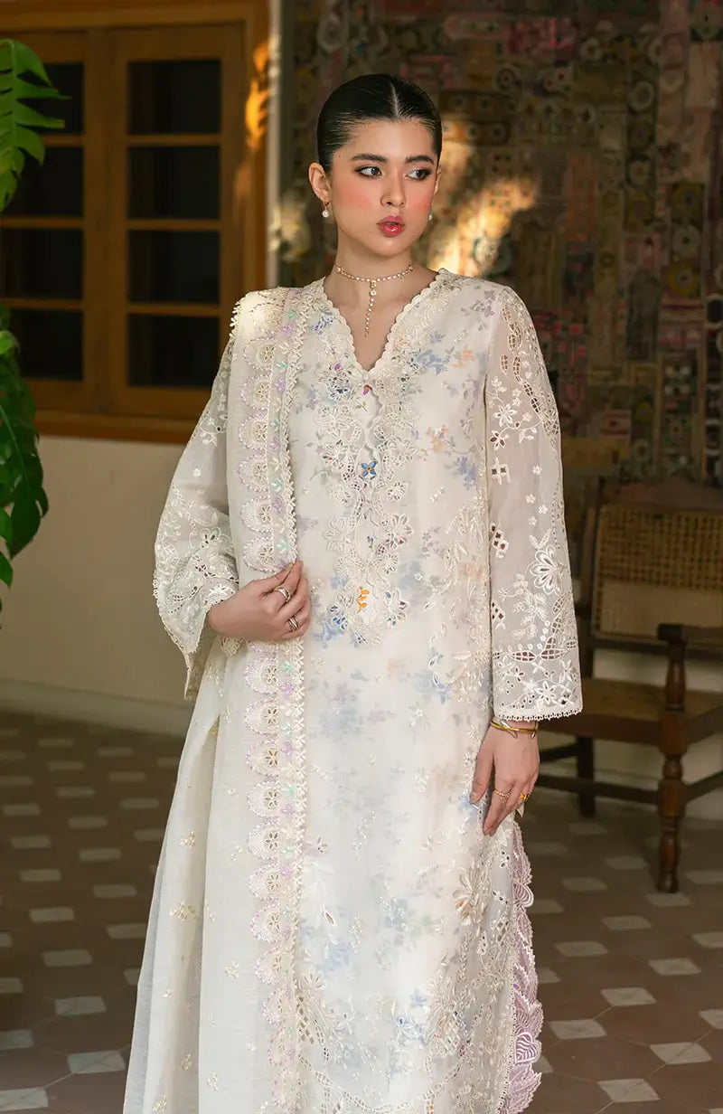 Step into summer season with this enchanting white ensemble! The double-layered paper lawn shirt showcases a rounded hem and exquisite white-on-white embroidery, while a cutworky lilac border gracefully traces climbing vines. Paired with pleated trousers adorned with leafy appliqué on the hem and a breezy Cotton net dupatta featuring an embroidered border, this outfit is designed for twirling through all the festive fun!